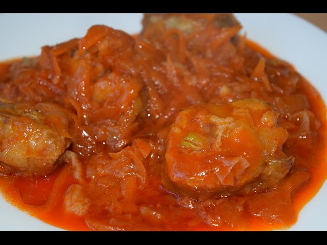 Заливают водой или бульоном, сваренным из рыбных отходов, доводят до кипения, добавляют пассерованные томат-пюре, сахар, соль, закрывают крышкой и тушат до готовности – 45 – 50 мин. За 5 мин до готовности вводят специи.