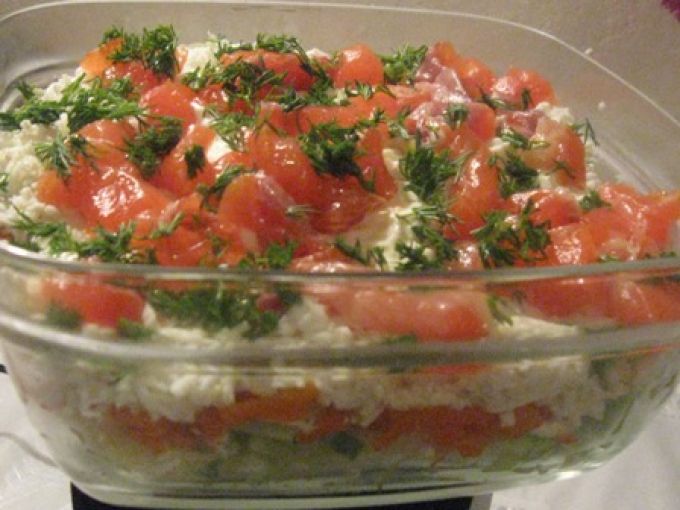 8. Слоеный салат из семги, помидоров, твердого сыра и картофеля